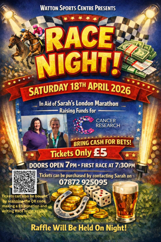 Tickets cost only £5, and can be purchased either HERE and donating with the reference “Race Night,” or by calling Sarah directly on: 07872925095